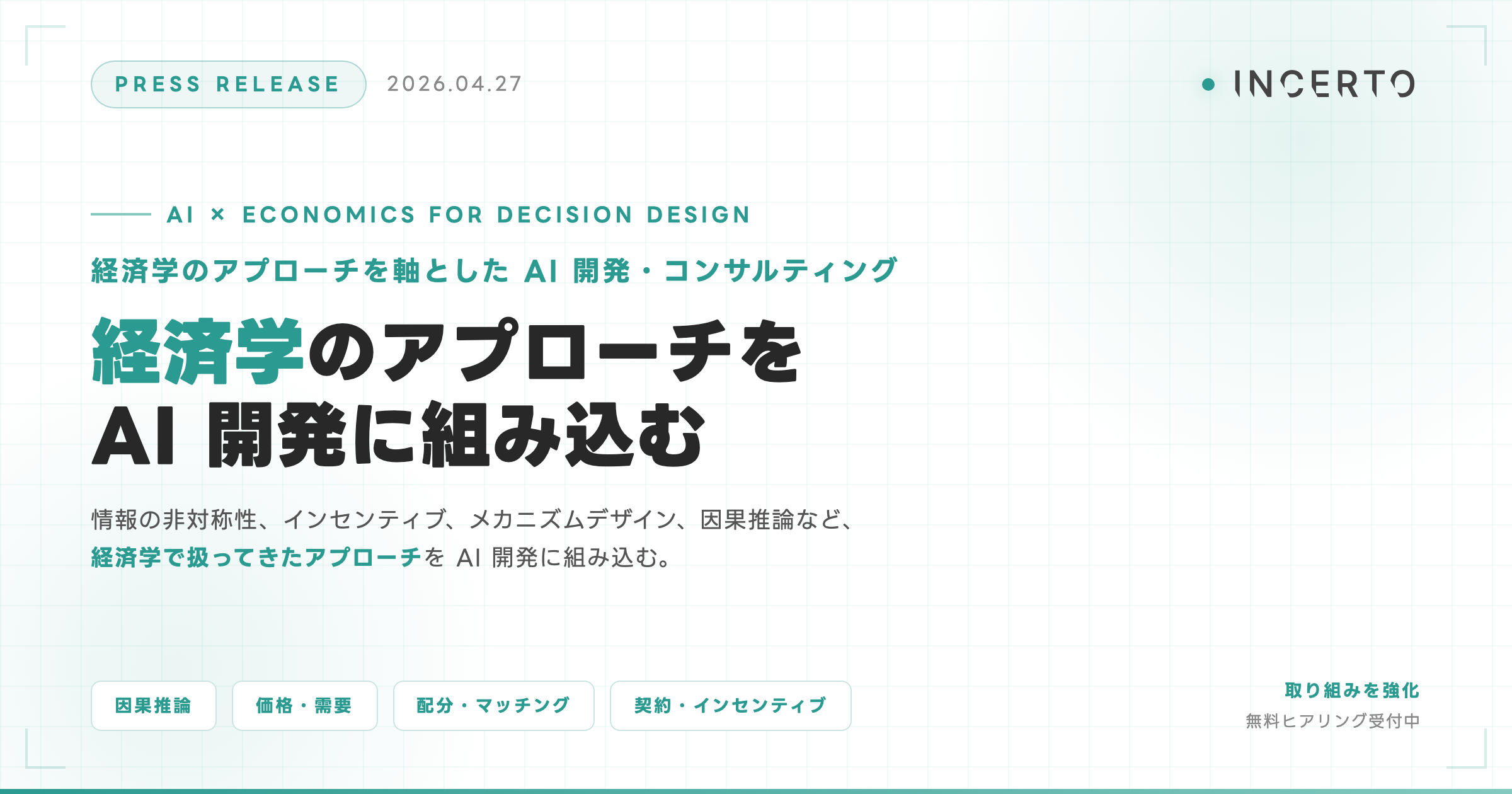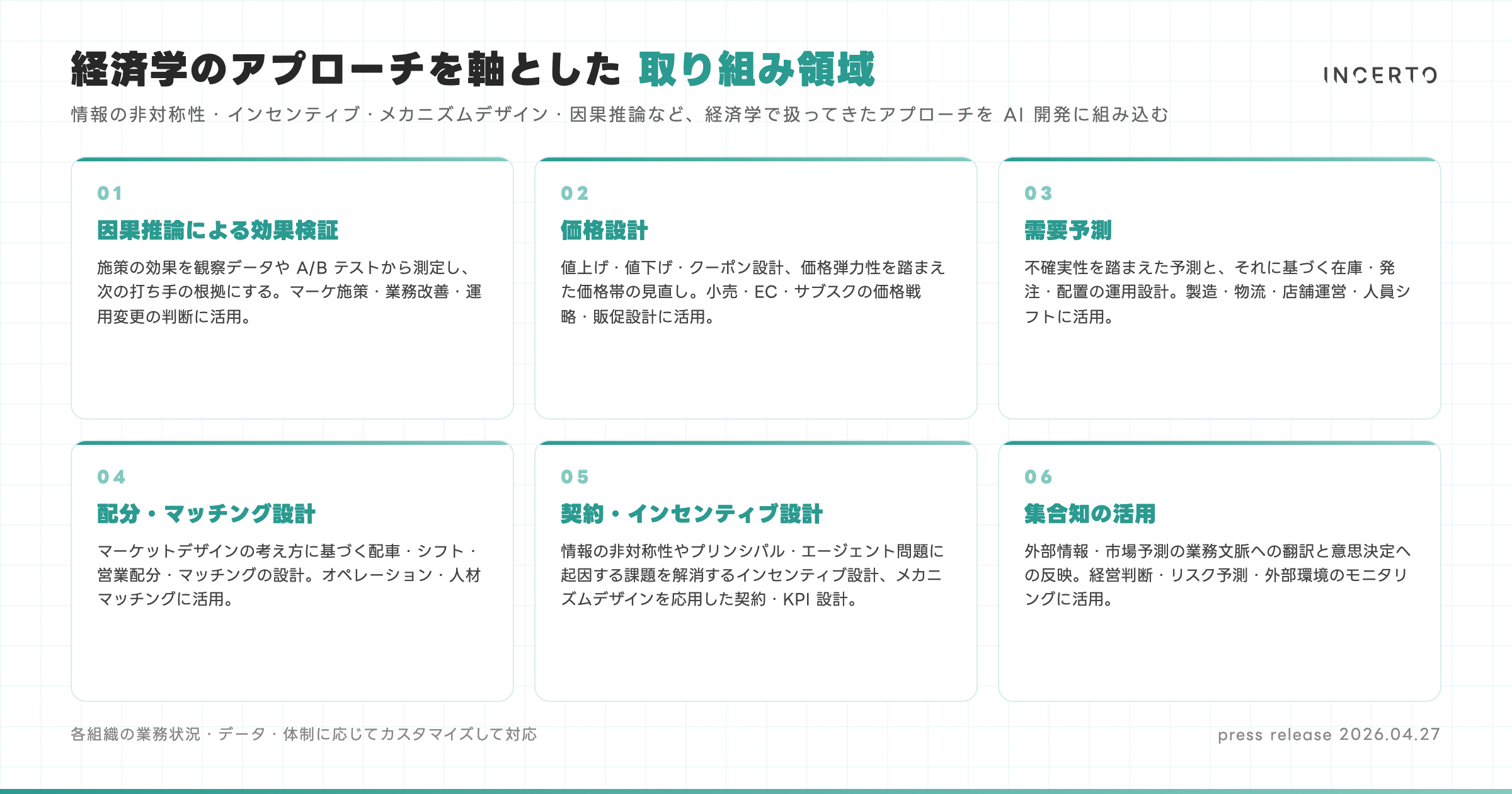 情報の非対称性、インセンティブ、メカニズムデザイン、因果推論など、経済学のアプローチを AI 開発に組み込み、価格・需要・配分・契約設計まで支援
